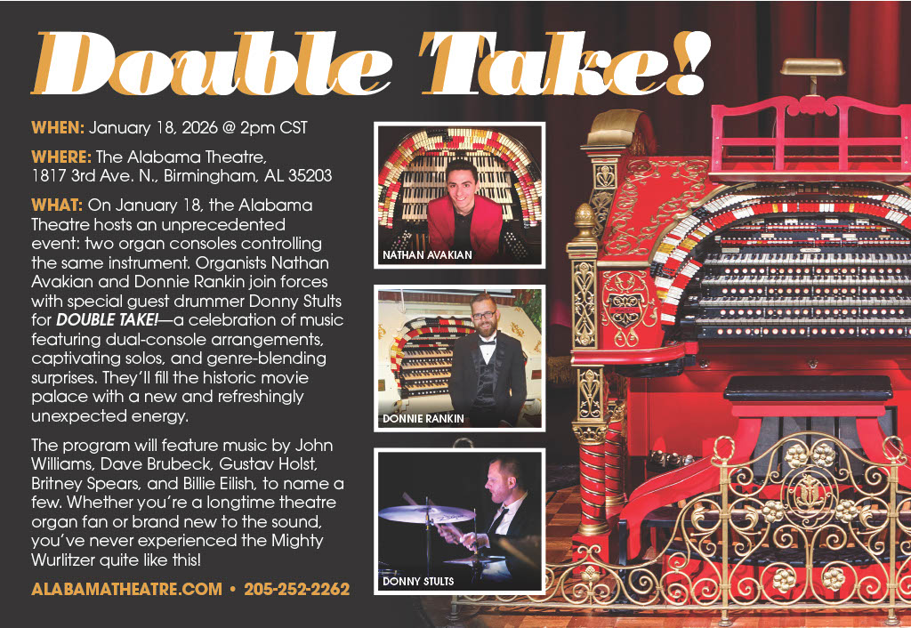 We're glad you found our site, and we encourage you to explore the features of our site and to join us for theatre organ shows at the Alabama Theatre at 1817 Third Avenue North, Birmingham, AL.